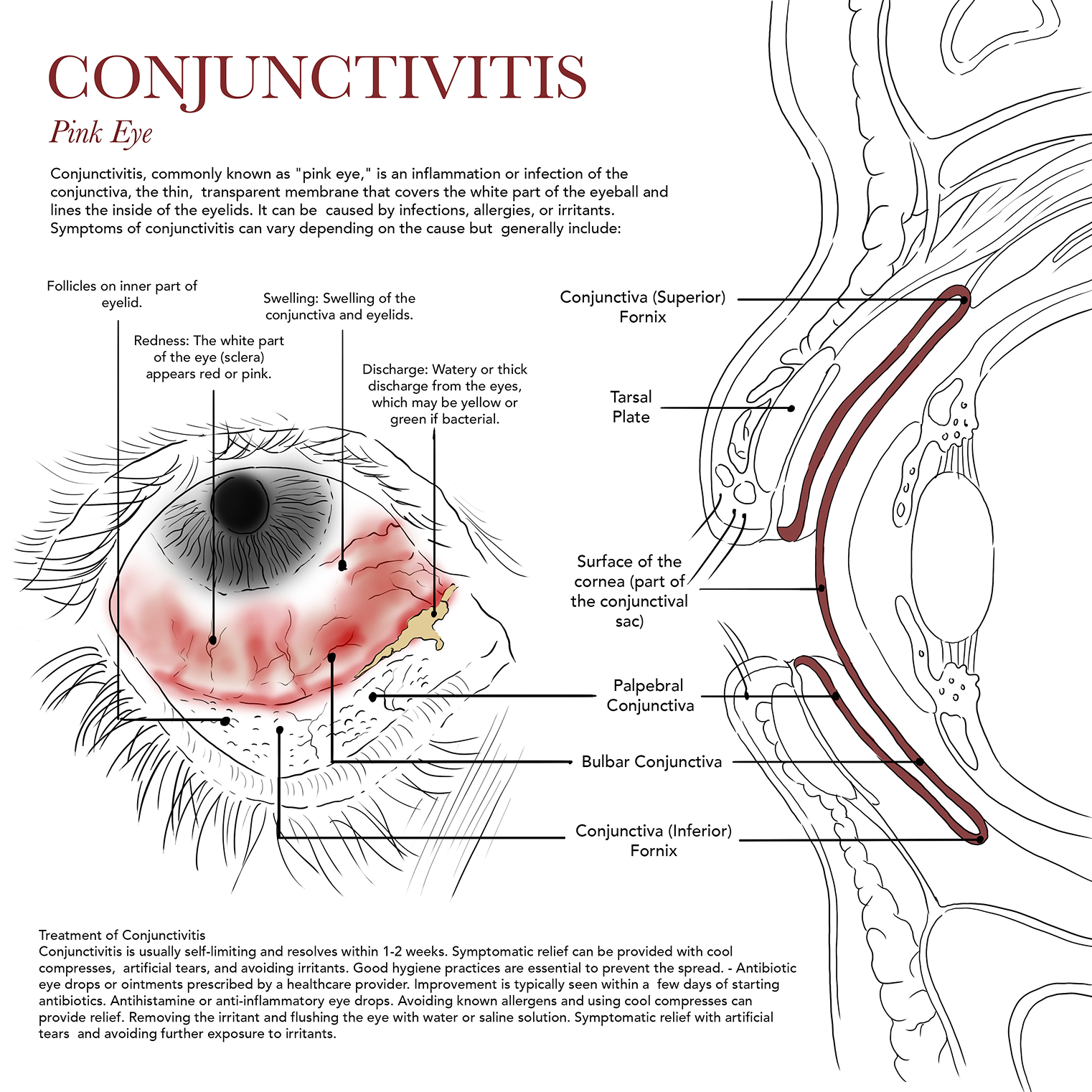 In developing this illustration, I aimed to capture a high level of anatomical detail by consulting photographic references from the NIH Image Gallery alongside ophthalmology textbook images. I also chose to retain elements of line art in the final rendering to provide a stylistic touch that enhances clarity and structure. While the sagittal cross-section of the eye was not essential for depicting conjunctivitis symptoms, I included it as an informative addition to deepen my own understanding of ocular anatomy and to illustrate how the various parts of the conjunctiva fit within this perspective.